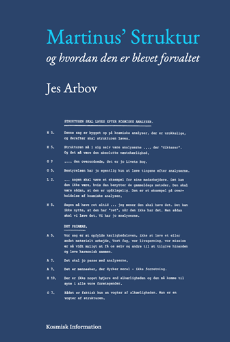 - Jes Arbov: Martinus’ Struktur. Bogen præsenterer den kosmiske Struktur, som Martinus lagde til grund for sin missions videreførelse. Den viser samtidig, hvordan MartinusInstitut har administreret Strukturen, efter Martinus forlod det fysiske plan. Bogen kan, så længe lager haves, fås ved henvendelse til jesarbov@gmail.com eller +45 3028 3254.